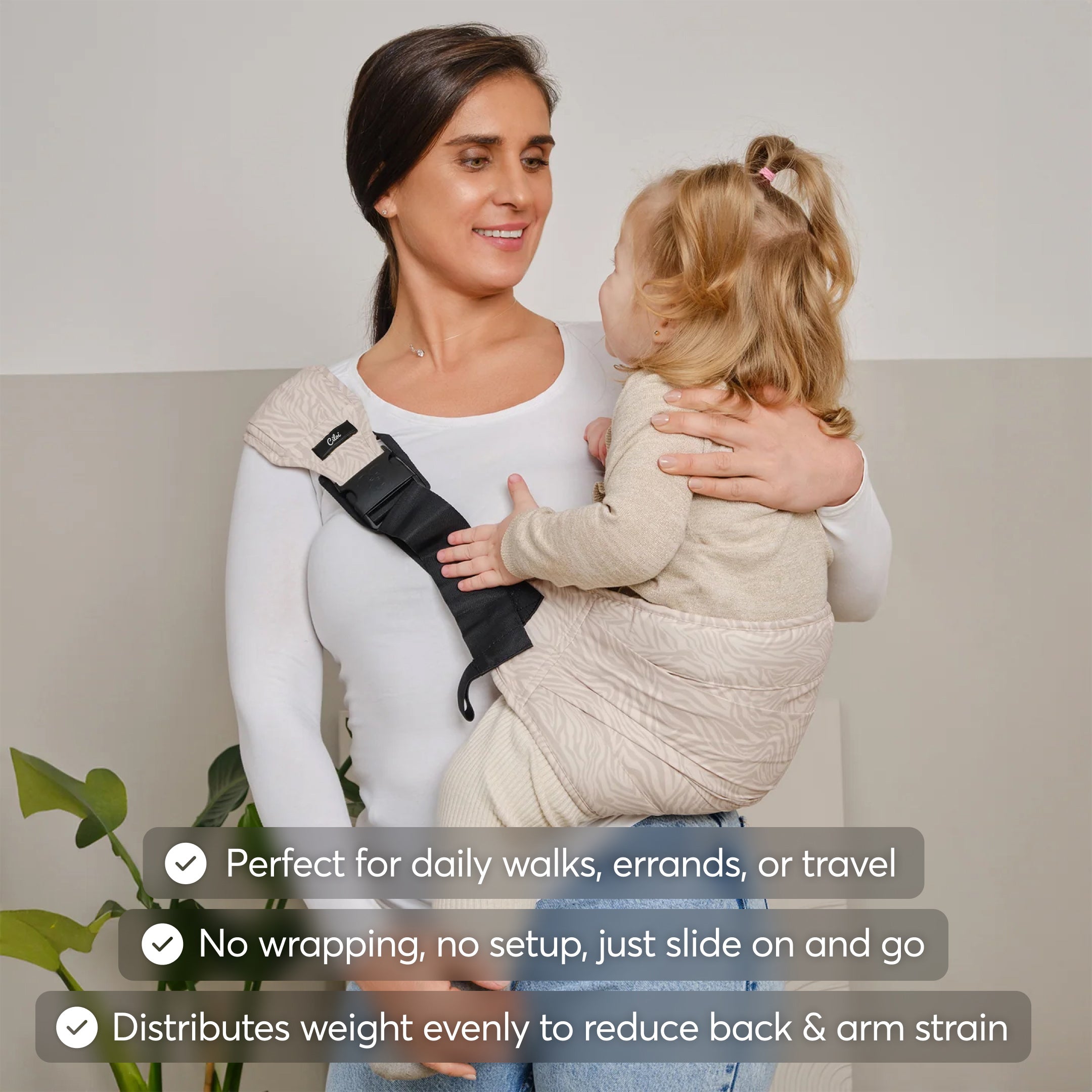 Holding a toddler on your hip leads to back pain, poor posture and exhaustion. This carrier evenly distributes their weight across your body for easy, pain-free carrying anywhere.